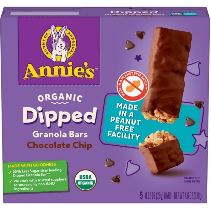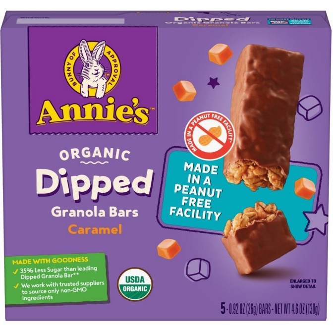 The Annie’s bars—Dipped Chocolate Chip Granola Bars and Dipped Caramel Granola Bars—are the same bars you know and love, now made in a peanut free facility. The bars are also USDA certified organic and made with 35% less sugar compared to the original Annie’s Dipped Granola Bars.